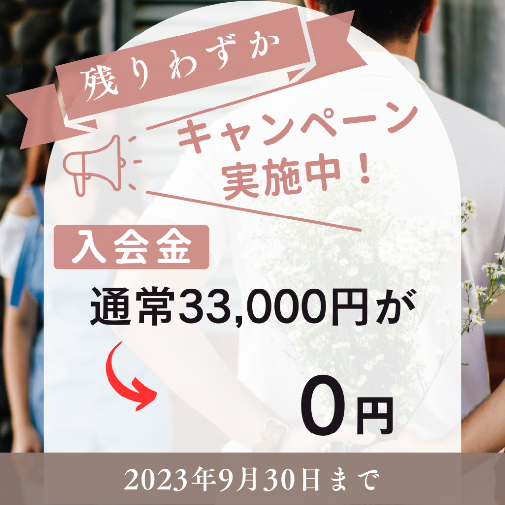 先着5名様限定 入会金 通常33000円を 限定価格0円キャンペーン中です。(9月末まで)※初期費用として、入会金以外別途かかります。 そろそろ結婚したい! 今年中に相手を見つけたい! クリスマスや年末年始を一緒に過ごす人を見つけたい! 8・9月ころ... -